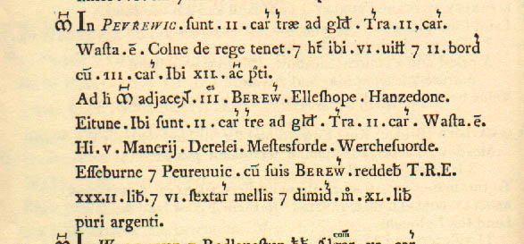 | In Parwich 2c of land taxable. Land for 2 ploughs. Waste. Coln holds from the King. He has 6 villagers and 2 smallholders with 3 ploughs Meadow, 12 acres. Attached to this manor are 3 outliers, ALSOP, HANSON and (cold) EATON. 2c of land taxable. Land for 2 ploughs. Waste These fivemanors. DARLEY< MATLOCK (Bridge) WIRKSWORTH ASHBOURNE and PARWICH with their outliers paid £32 and 6½ sesters of honey before 1066; now £40 pure silver. |