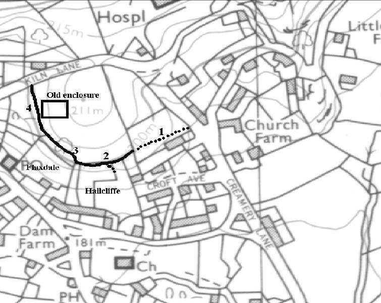 Where the number 2 is marked there is a possible curve or fork in the terrace. It seems to continue on the level, but there is also some suggestion that it also cuts across the corner of Hallcliffe orchard into Hallcliffe paddock. The old gateway (between the two fields) with a large undressed gatepost is slightly to the east of this possible fork. The hedgerow running from Kiln Lane to the end bungalow on Croft Avenue contains a remarkably wide and deep ditch, almost large enough to be an eroded hollow way, though it seems unlikely there would be a trackway here.