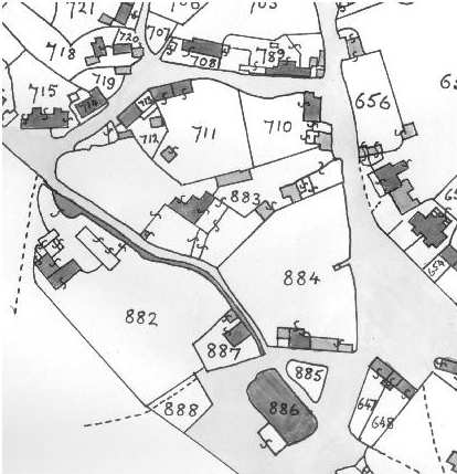 A section of the 1843 Tithe Award map copied by Brian Foden with 710 Brentwood, 882 Flatts Stile, 883 the Fold, 884 Dam Farm and 887 Japonica