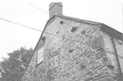There is visible evidence on the older buildings of altered rooflines, raised eaves, and so on. Generally, the larger C18 houses have raised gable ends and chimneys with water tabling. In photographs (1) and (2) the water tabling can be clearly seen. Fernlea, an C18 house retains two sets of joists – one for the current roof, and another for the original thatch (Trewhitt). In photograph (3) the evidence for the altered roofline is clear, and what appears to be water tabling is visible on the stack of the adjoining house.