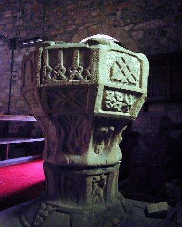 The ancient carved font, with a detail shown above right, fortunately survived the Reformation. One explanation is that it was plastered and painted, hiding the carvings from the ‘reformers’