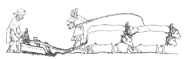 The heavy plough needed to be pulled by oxen, usually six or eight yoked in pairs and managed by a ploughman and a ploughboy. The most awkward and time consuming part of the ploughing process was turning the plough at the end of the furrow, and because of this the furrow was made as long as possible, about 220 yards, becoming a furlong or long furrow. Many strips are in the form of a reverse S shape, this is caused by the turning room needed at the end of each furrow to turn the cumbersome plough and oxen. It is shown in wills and inventories that oxen were still used in Parwich well into the 17th century, they seemed to have been owned in pairs by individual farmers, who probably pooled together to form plough teams.