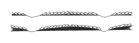 Ridge and furrow was formed by the action of ploughing with a ‘heavy’ plough, that is to say, a plough that is capable of turning over a sod. To do this the plough needed to have a coulter to cut a straight line in front of the share blade, the share did the actual ploughing, and the sod was turned to one side by a mould-board to form a furrow. Therefore ridge and furrow can be of any date after the introduction of the heavy plough and not necessarily medieval, but by the eleventh century this type of plough was in use over most of England. To form ridge and furrow a normal furrow is cut across the field, then on the second or return run, another furrow is cut alongside the first and turned in to lean against it. The third run is made next to the first and turned in against it gradually pushing the soil towards the centre thus starting to form a ridge. This process is repeated backwards and forwards across the field until the desired width of ridge is obtained. Obviously one ploughing will not form a ridge it needs repeated ploughing of the same strip over a long period of time to build up to any noticeable height.